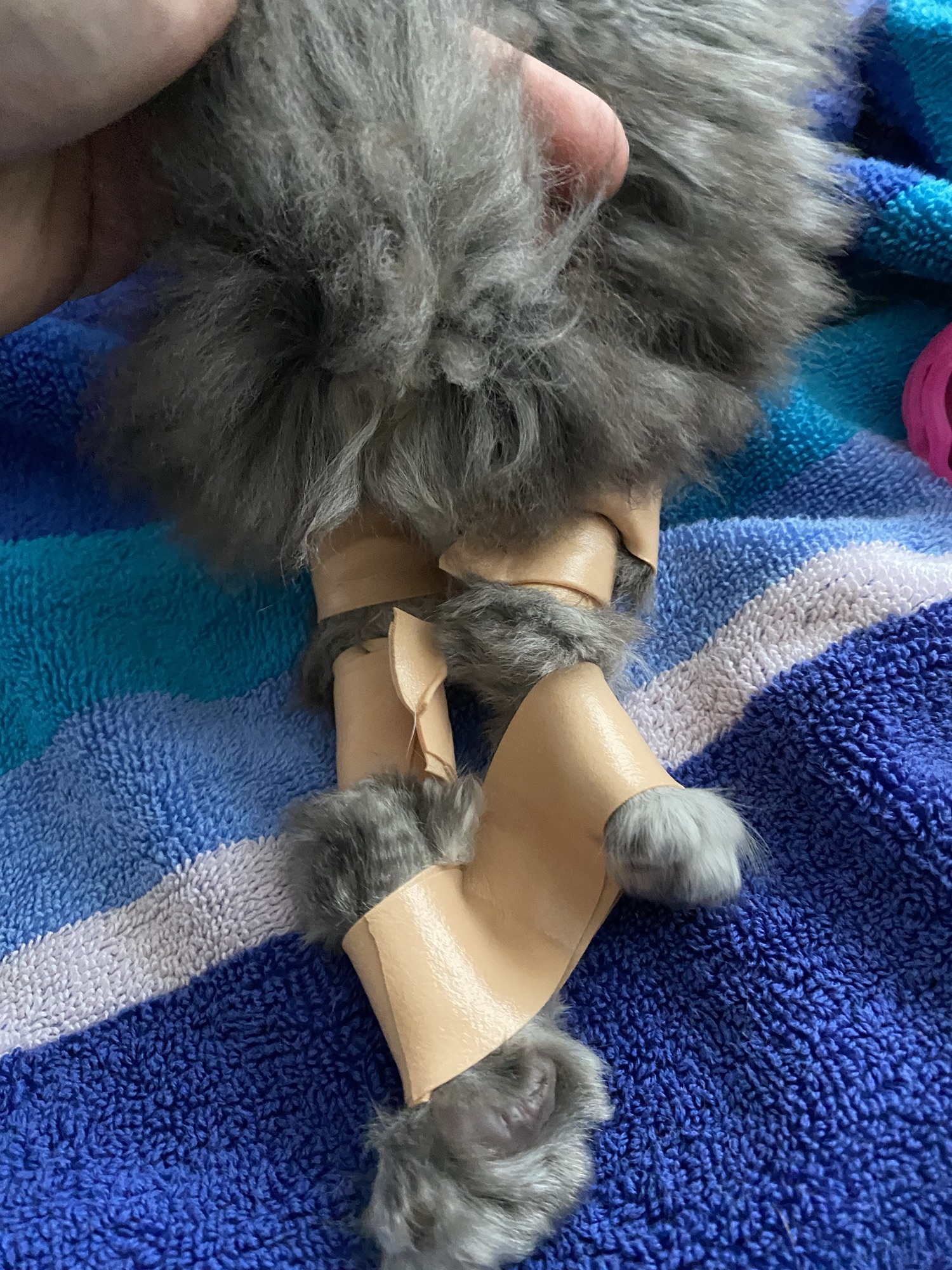 Unfortunately, it is not a well studied issue despite being found in kittens, puppies, and even wild animals. Even the vet didn’t know a lot about it and had to do some research. Sadly, most animals that develop this way are euthanized instead of rehabbing. We all agreed that she was worth giving our best effort. So off to google I went researching all the best ways to PT and shackle. I found so many different ways to bind the legs that my head was spinning. Everyone used different material, they shackled on different parts of the leg. The puppy videos weren’t helpful because their legs were so much bigger. There was even a snow leopard cub at the Bronx zoo with swimmers syndrome, but again, her legs were so much bigger to work with I couldn’t relate with how they shackled. Moxie only weighs 1.5 lbs, there isn’t much leg for me to get around without totally binding her up.